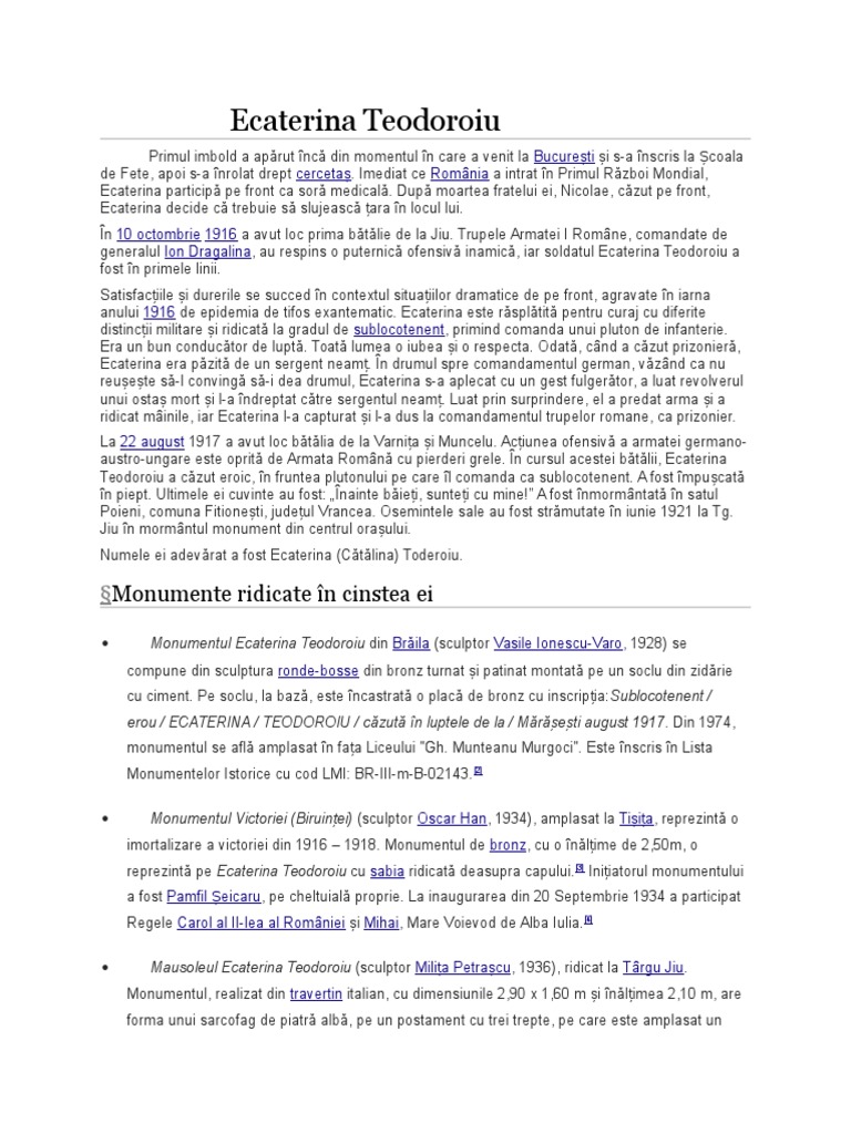 Parintii ecaterinei au muncit din greu pe mosia boierilui pleniceanu. Ideea ridicării unui monument în cinstea eroinei ecaterina teodoroiu a aparţinut învăţătoarei parascheva dumitru, directoarea şcolii nr. The story of heroine ecaterina teodoroiu, the only woman who fought in the romanian army during world war 1.