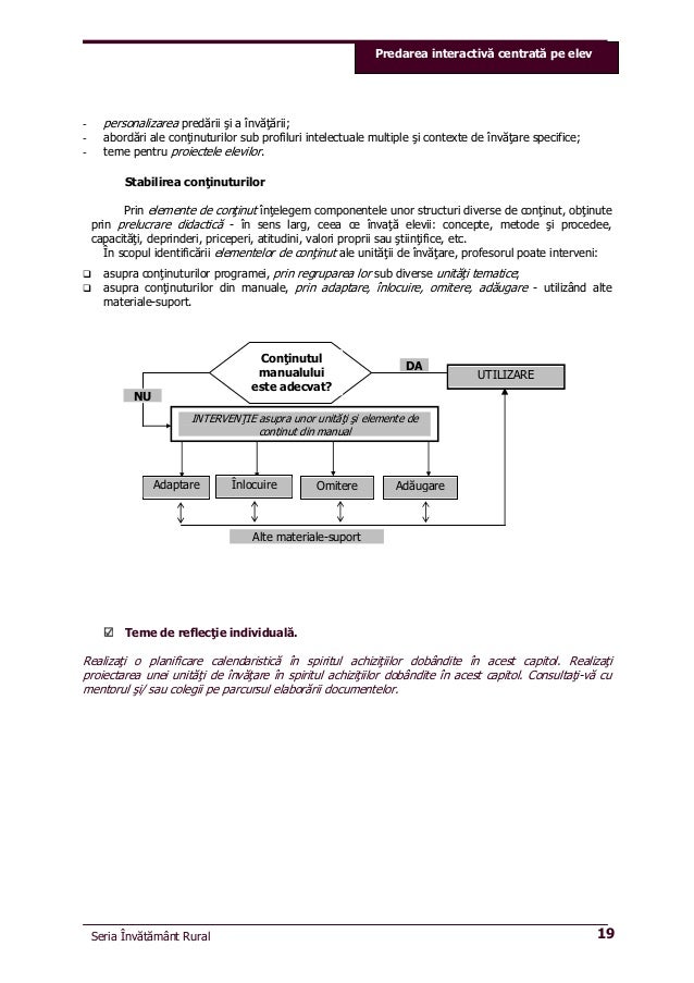 Predarea interactivă centrată pe elev argument facilitarea învăţării interactive este unul dintre cele 4 module de bază pregătite pentrusubcomponenta învăţătorul/profesorul poate opta pentru folosirea activităţilor de învăţare recomandateprin programă sau poate propune alte activităţi adecvate. Managementul si metodologia activitatii stiintifice si intelectuale independente; Metode de învăţare centrată pe elev.